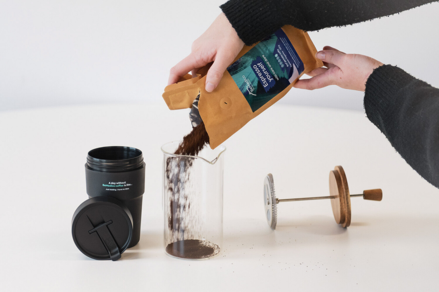 Naast de duurzame beker van GroundsUP – gemaakt uit gerecycleerd koffiegruis – bevat ons koffiepakket een French press kannetje en een zakje heerlijke fairtradekoffie. De BeMedico Organic Espresso is een 100% Arabica-blend met bonen uit de beste koffieregio’s.